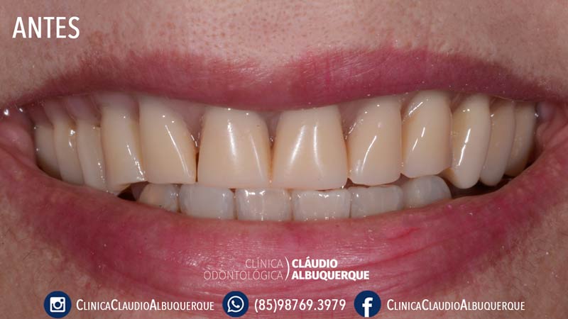 Falando agora de estética do nosso caso clínico, a dentadura de nossa paciente encontrava-se bastante antiga, desgastada e amarelada, o que além dos problemas de saúde bucal, envelhecia e muito o rosto da paciente como um todo. Dentes com má aparência ou faltando envelhece demais as pessoas, por isso, se você usa uma dentadura envelhecida, toda sua aparência também envelhece. O que é sem dúvidas um grande motivo para se livrar da dentadura: ter um rosto mais jovem!