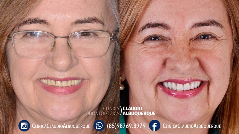 Buscando um sorriso mais bonito, amplo, e jovial, Dona Adalúcia recebeu de surpresa, logo na primeira consulta uma ótima notícia: em apenas dois dias todos os procedimentos dos implantes seriam realizados e depois desses dois dias, teria uma prótese fixa sobre implantes, que não corre o risco de soltar ou cair, nem machuca a gengiva, e ainda iria rejuvenescer uns bons anos na aparência do rosto como uma espécie de “bônus” em sua transformação de sorriso, afinal dentes renovados são sinônimo de rosto renovado! Quer ver o resultado da transformação? Veja as imagens abaixo: